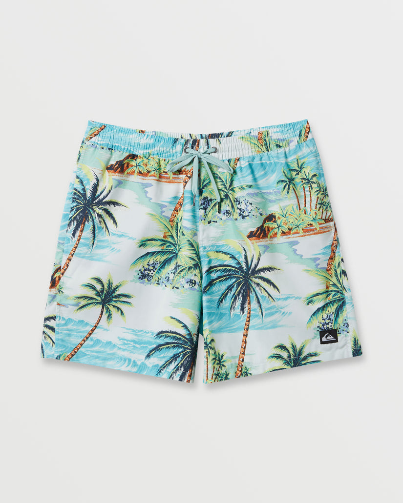 beachside style that won't weigh you down. These 17" Everyday Mix Volleys from Quiksilver are made with our innovative Remade SuperSuede fabric that's engineered with recycled and upcycled material, then topped with a PFC-free hydrophobic treatment for quick-drying performance. The straight-leg fit and classic comfort waistband keep things relaxed, while the seasonal print provides style for your everyday adventures. Featured here in the Beach Glass colorway.