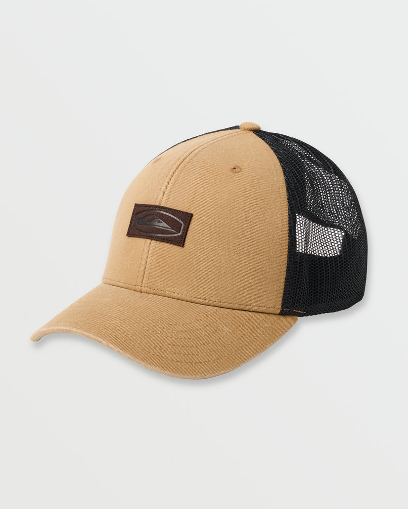 Our Forever Hat: a classic 6 panel snapback trucker with washed fabric and faux leather patch that works for any look. Crafted from partially recycled polyester / cotton for easygoing style and environmental consciousness. Featured here in the Almond colorway.