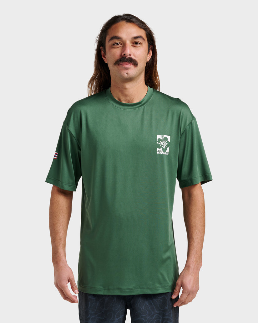 Our Hi Surf Tee Short Sleeve is your perfect surf shirt, with a comfortable regular fit and quick-drying polyester / spandex blend. Featuring Hawaii-inspired screen-printed art, it's a stylish yet sporty tee for catching waves or hanging loose. Featured here in the Trekking Green colorway.
